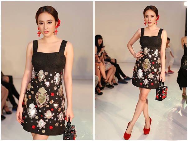 | Góp mặt ở sự kiện thời trang cuối tháng 6, Angela Phương Trinh chọn trang phục và phụ kiện của Dolce & Gabbana để giúp mình nổi bật. Túi xách, giày, hoa tai... ton sur ton mang lại vẻ hoàn hảo cho set đồ đẳng cấp. |