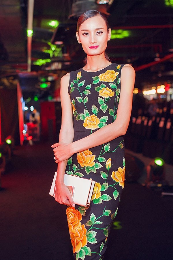 | Họa tiết hoa mộc lan làm điểm nhấn cho bộ váy dự tiệc tối màu của Trương Thị May. Thiết kế kín đáo vừa vặn với hình tượng đoan trang, nữ tính của á hậu. |