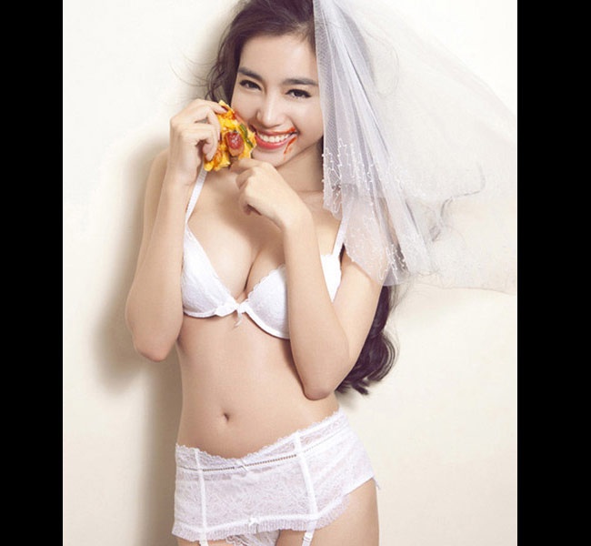 | Thái Hà lạ lẫm cùng nội y cưới. |