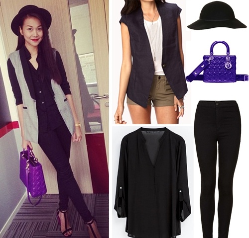 | Cá tính với phong cách menswear với sự kết hợp của sơ mi Zara, quần Topshop, gilet Forever21 và mũ Topshop. |