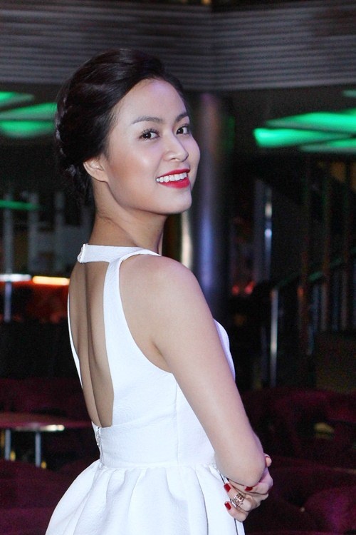 | Nữ ca sĩ Minh Hằng diện bộ váy có phom dáng xòe độc đáo, kín mít phía trước nhưng để lộ khoảng lưng trần quyến rũ phía sau. |