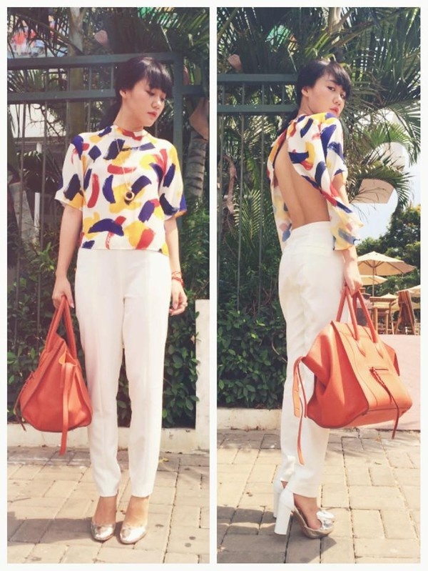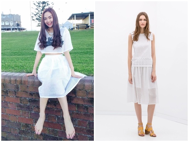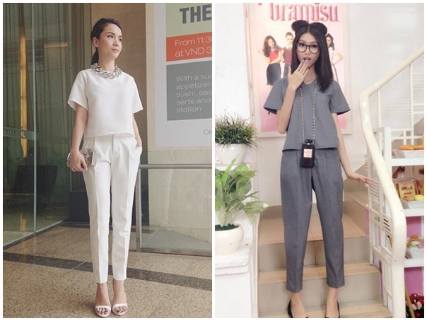 Yến Trang và Thùy Dương mặc phiên bản màu trắng theo xu hướng trang phục đơn sắc (monochrome) thời thượng. Hai sản phẩm thời trang của một thương hiệu đồ thiết kế giá rẻ Việt với áo cổ chữ V có giá 400 ngàn đồng và quần baggy vải 650 ngàn đồng.
