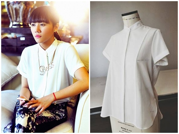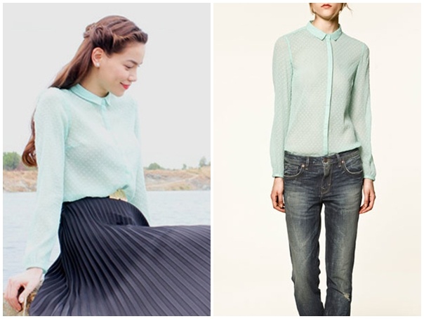Là tín đồ thời trang Zara, Hồ Ngọc Hà sở hữu nhiều kiểu áo sơ-mi đơn giản và tinh tế. Trong ảnh, cô diện sơmi cổ Peter Pan gam màu xanh bạc hà với chi tiết đính nổi độc đáo. Một thiết kế được bán với giá 35,9 USD (khoảng 700 ngàn đồng).