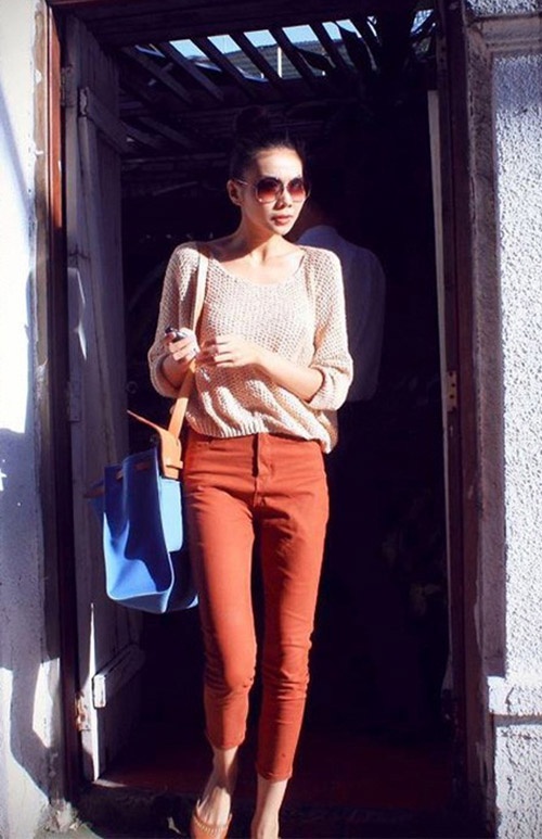 Mẫu quần skinny màu mè của Zara mang lại cảm giác thoải mái được Thanh Hằng yêu thích một thời gian dài. Cô diện khi xuống phố gặp gỡ bạn bè, đối tác công việc.