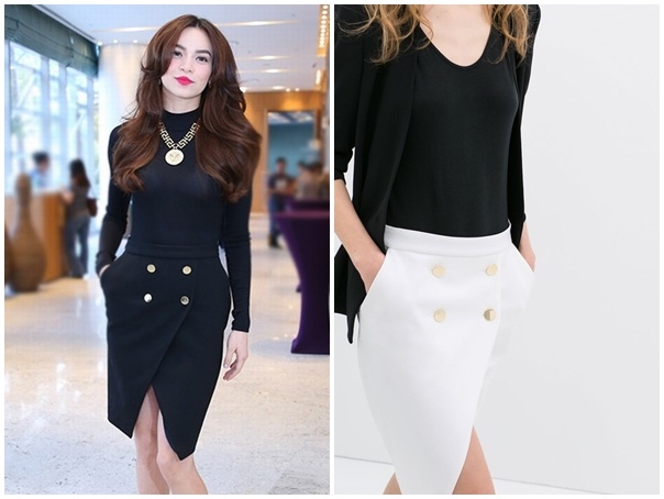 Tham dự họp báo ra mắt chương trình Nhân tố bí ẩn 2014, Hồ Ngọc Hà nổi bật trong chiếc wrap-skirt (loại váy xếp vạt chéo) với kiểu dáng tối giản nhưng thời thượng của Zara. Bà mẹ một con phối trang phục theo trào lưu monochrome. Chiếc váy Zara này có giá hơn 1,2 triệu VND.