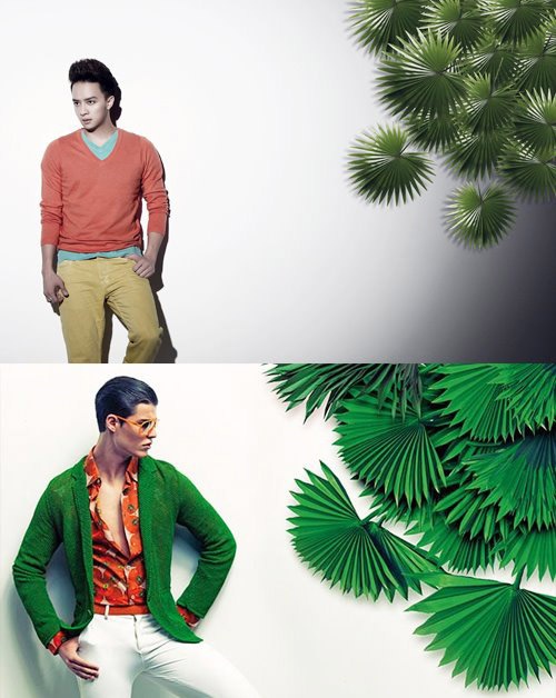 | Bộ ảnh chụp quảng cáo cho các sản phẩm của thương hiệu thời trang nổi tiếng nước ngoài với những cành cọ xanh đặt ở góc ảnh đã khiến Cao Thái Sơn thích thú. Vì vậy, anh cũng chẳng ngần ngại thực hiện bộ ảnh cho riêng mình với hình thức na ná. |