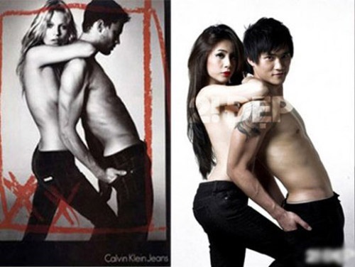 | Cặp đôi Công Vinh - Thủy Tiên lựa chọn trang phục và tạo dáng quá giống bức hình quảng cáo của một nhãn hiệu thời trang nổi tiếng. |