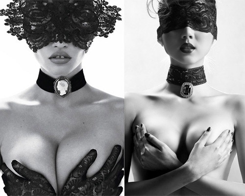 | Ngọc Quyên chụp hình với ngực trần, mắt bị bịt kín bằng dải băng ren đen, cổ đeo vòng đen có mặt đá và hai tay đan chéo ôm đẩy đôi gò bồng đảo giống người mẫu nội y nóng bỏng Lara Stone. |
