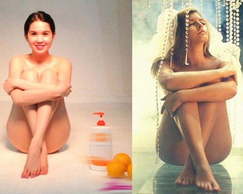 | Ngọc Trinh mới đây cũng bị nghi ngờ về việc “đạo” ý tưởng chụp hình của mẫu Tây Andrea Aybar khi bức hình nude cô chụp quảng cáo cho một nhãn hàng có tư thế chụp khá giống với Andrea. |