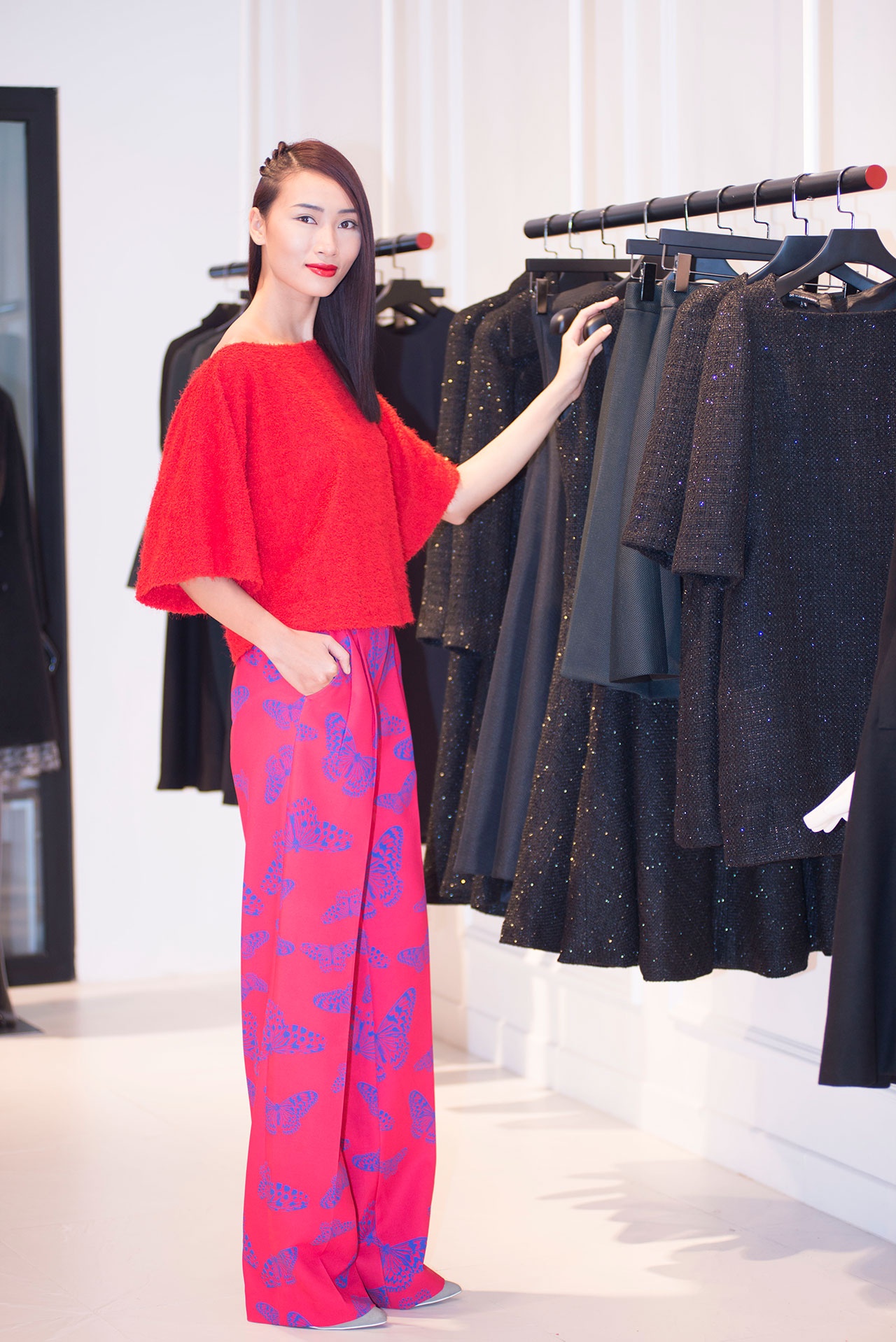 Là khách hàng gắn bó lâu năm với NTK, diễn viên múa Linh Nga không thể vắng mặt trong sự kiện quan trọng này. Linh Nga diện một thiết kế mùa thu kín đáo. Nổi bật trên nền vải tông hồng trẻ trung là họa tiết bướm in đều có gam màu xanh cô ban tạo nên tổng thể thanh lịch.