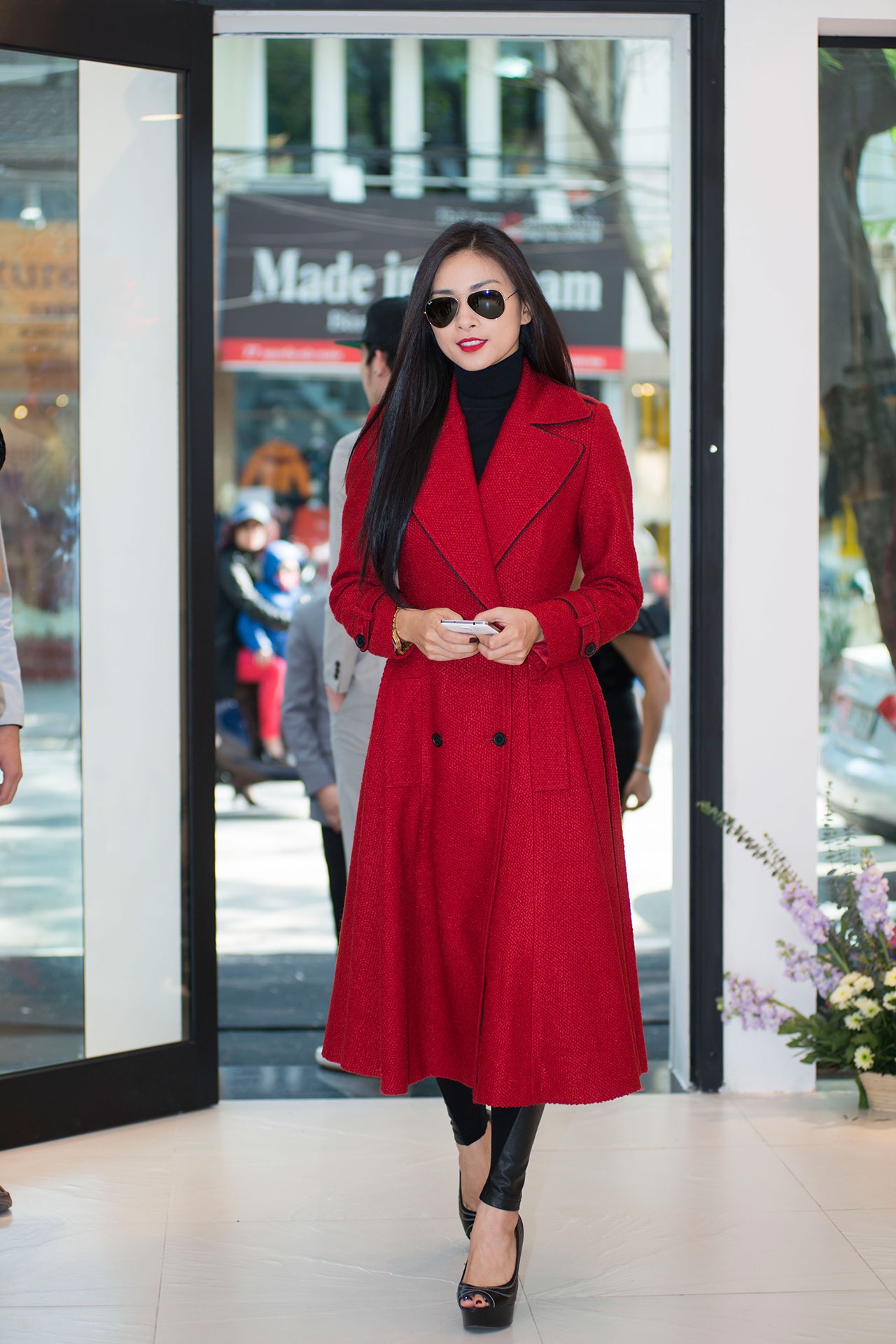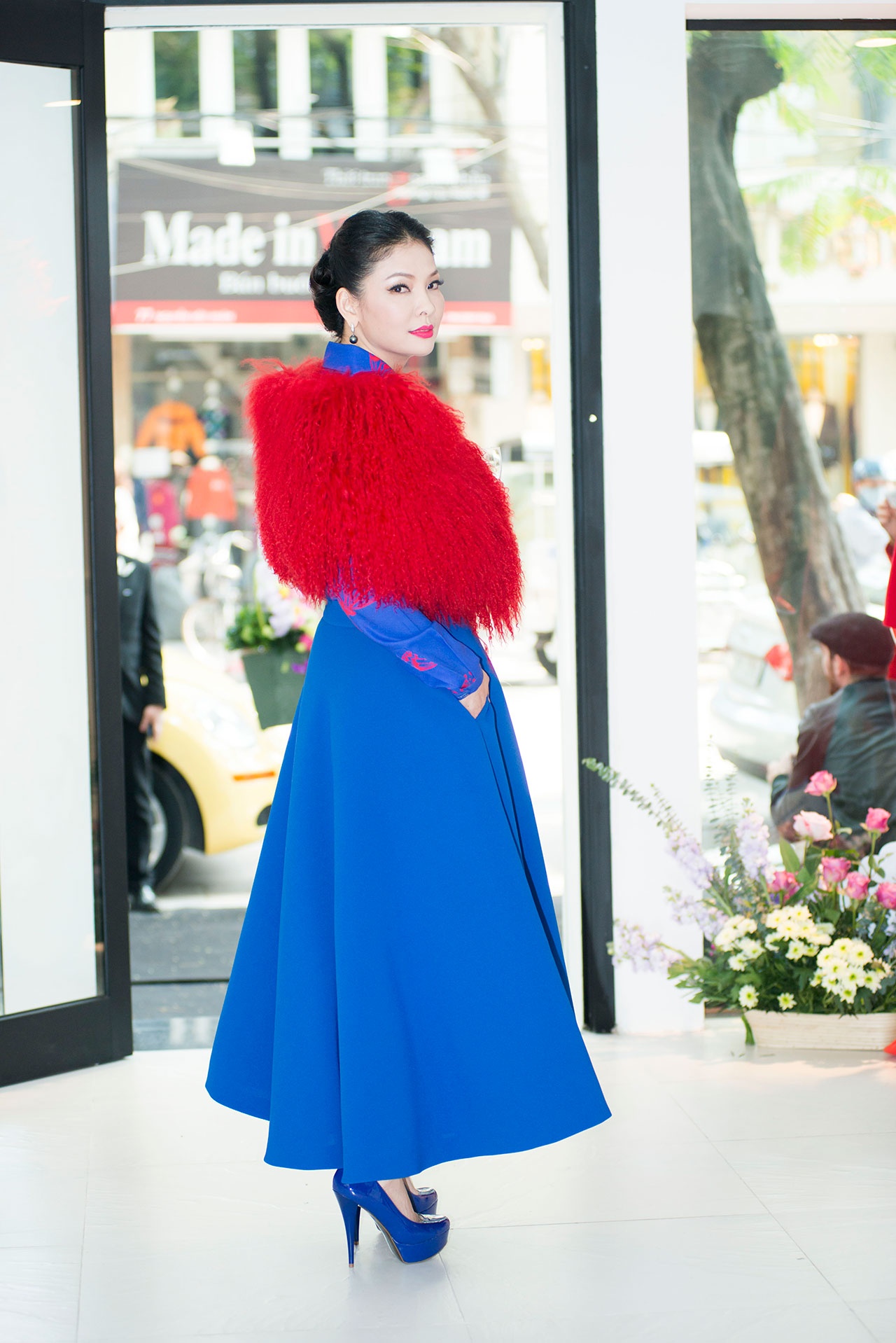 Cựu người mẫu Thủy Hương phối trang phục khá ấn tượng với khăn choàng lông gam đỏ hòa hợp với trang phục thu đông.