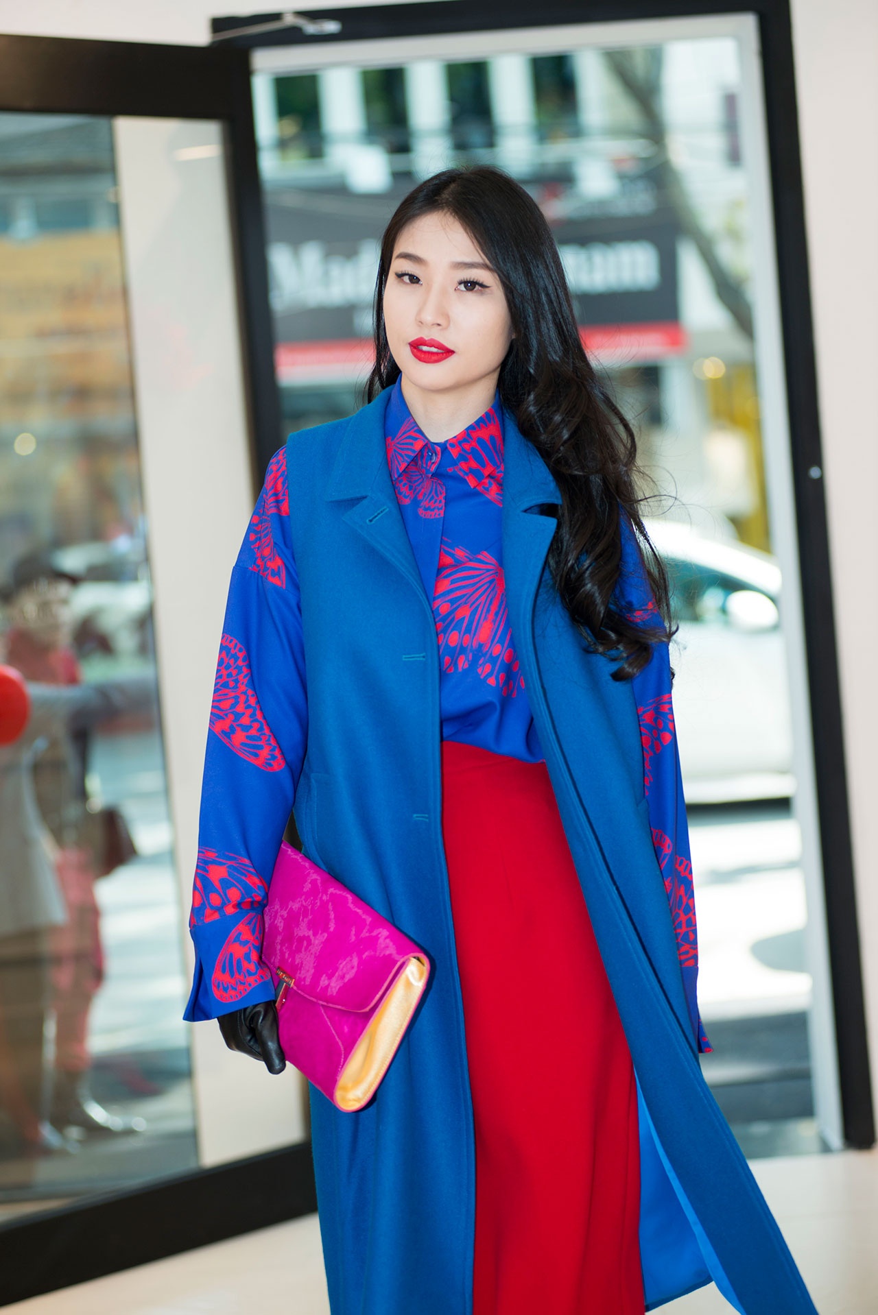 Á hậu Minh Thư cũng không kém cạnh độ nổi bật khi đứng cạnh các người đẹp đình đám showbiz. Người đẹp chọn những gam màu nổi kết hợp vô cùng ăn nhập, phụ kiện clutch tông màu hồng rất hòa hợp.
