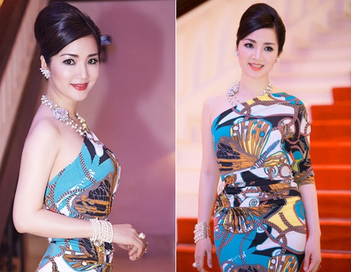 | Hoa hậu đền Hùng Giáng My là một trong những mỹ nhân có gu thời trang bất ổn. Phong độ thẩm mỹ xấu đẹp của cô thể hiện rõ nét qua những bộ trang phục và phụ kiện thiếu sự hòa hợp. Bên cạnh hình ảnh thanh lịch, gợi cảm, người đẹp không ít lần để lại hình ảnh diêm dúa, màu mè, không đáp ứng tính xu hướng trong mắt công chúng. Trong ảnh là bộ cánh được đánh giá cao về kiểu dáng, màu sắc tuy nhiên, phụ kiện chuỗi hạt đeo tay lại không mấy phù hợp với tổng thể. Vòng cổ, hoa tai vướng lỗi phối rườm rà và sến sẩm. |