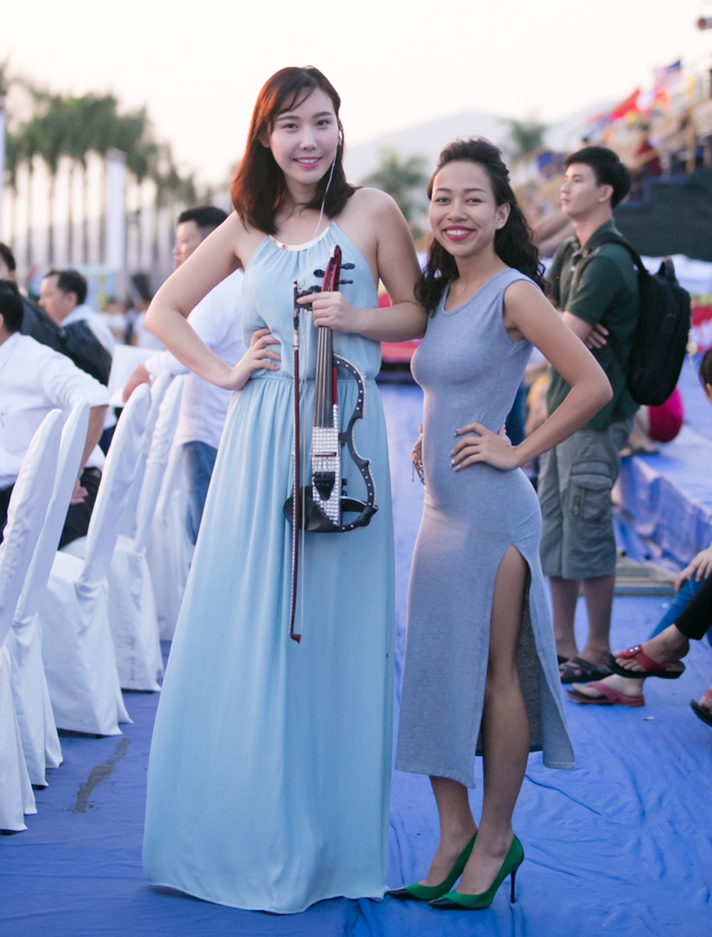Thảo Trang diện váy bó, xẻ cao chụp hình cùng J.Mi. Trong buổi tổng duyệt, mỹ nhân violin đặc biệt ấn tượng với giọng hát của cô nàng "xấu lạ". Theo cô, nữ ca sĩ Việt sở hữu vóc dáng nhỏ nhưng giọng hát "khủng".