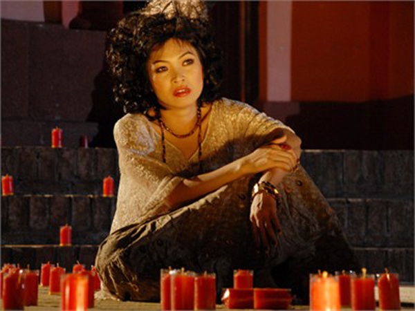 | Hình ảnh “nữ hoàng dao kéo” Phi Thanh Vân trong vai thầy bói có đôi mắt mù lòa khiến không ít khán giả ghê rợn. Đây là tạo hình của Phi Thanh Vân trong bộ phim truyền hình Ly hôn năm ngoái, cô vào vai một bà bói mù lòa sống không chồng con ở một ngôi làng vắng vẻ, có tài đoán số phận tương lai cho những ai có nhu cầu. |