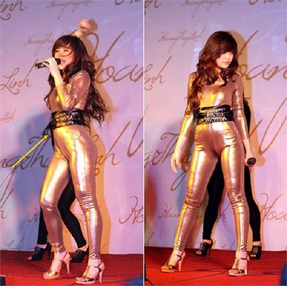 | Cô thường xuyên diện những chiếc quần bó cạp cao khi biểu diễn khiến cho đôi chân to hơn mức bình thường. |