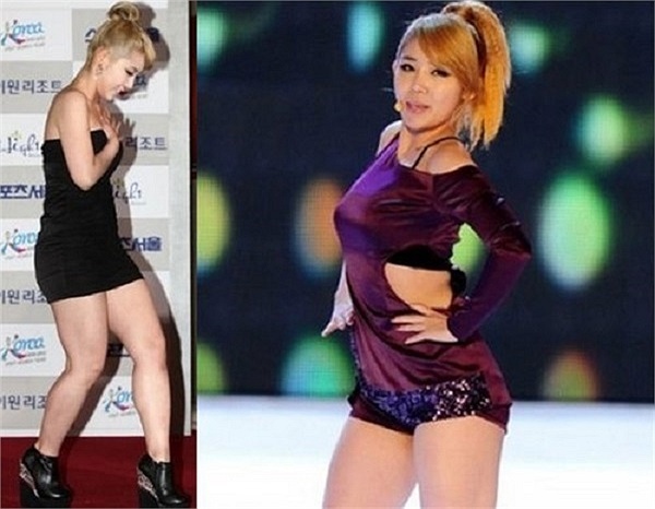 | Nữ ca sĩ Zinger xứ Hàn cũng chuộng mốt quần ngắn lên sân khấu để lộ bộ đùi to hơn bình thường. |