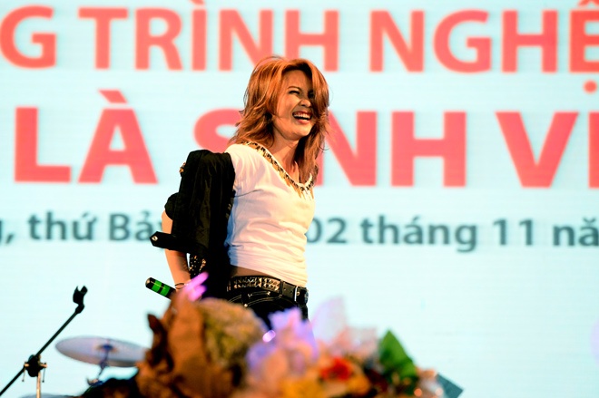 Trước đó, ngay sau khi hát hết ca khúc thứ ba, một nữ sinh viên đã trèo lên sân khấu hôn vào má "Họa mi tóc nâu" khiến cô ngỡ ngàng rơi cả bóng bay được tặng.