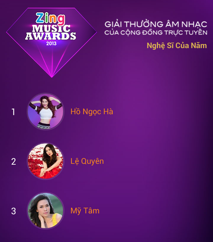 Bảng Nghệ sĩ của năm Zing Music Awards 2013 còn có sự tranh cử của Lệ Quyên nhưng sự xuất hiện đồng thời của Mỹ Tâm và Hồ Ngọc Hà lại khiến fan chú ý hơn cả.