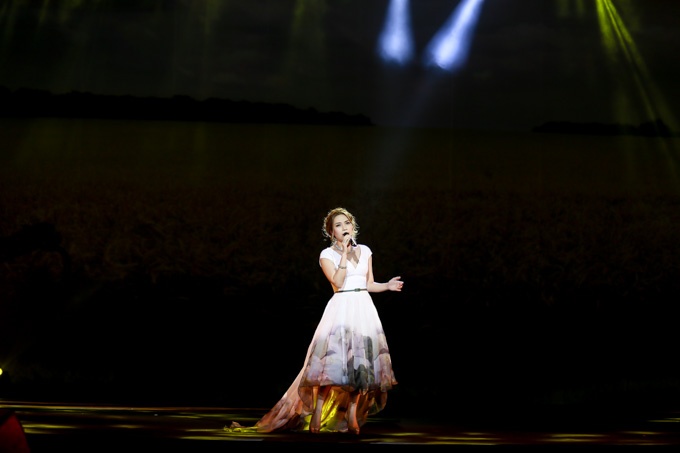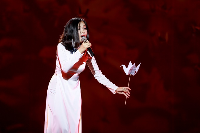 | Nữ ca sĩ Mỹ Tâm trình diễn ca khúc Thương ca tiếng Việt. |