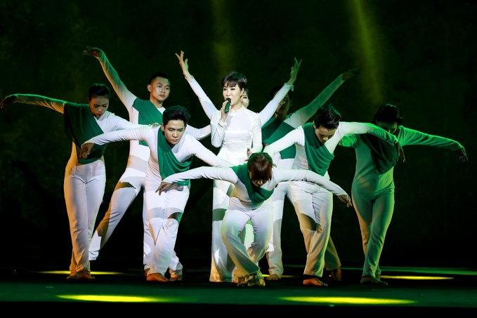 | Ca sĩ Uyên Linh kết hợp cùng vũ đoàn, thể hiện Một đời một rừng cây. |