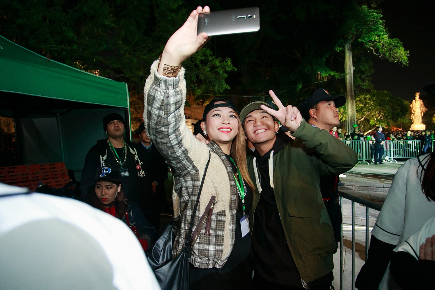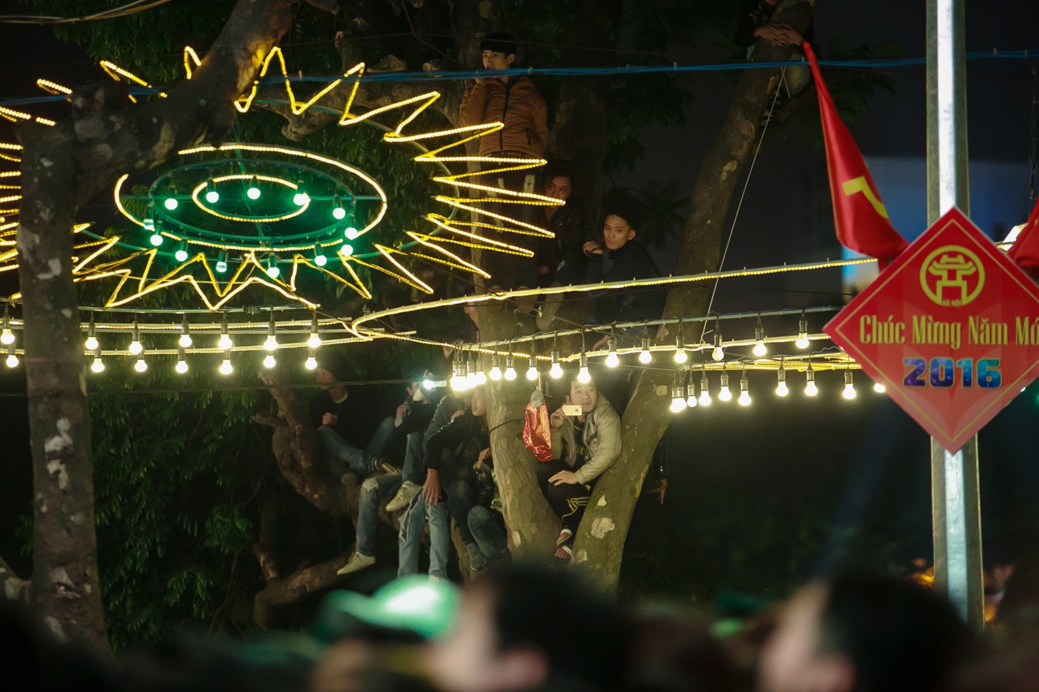 | Do quá đông nên vài khán giả trèo lên cây để có tầm nhìn tốt hơn. Tuy nhiên, hành động thiếu ý thức này lại ảnh hưởng tới chương trình khi MC Nguyên Khang nhiều lần phải tạm ngắt giữa chừng nhắc nhở các bạn trẻ nên xuống dưới để đảm bảo an toàn. |