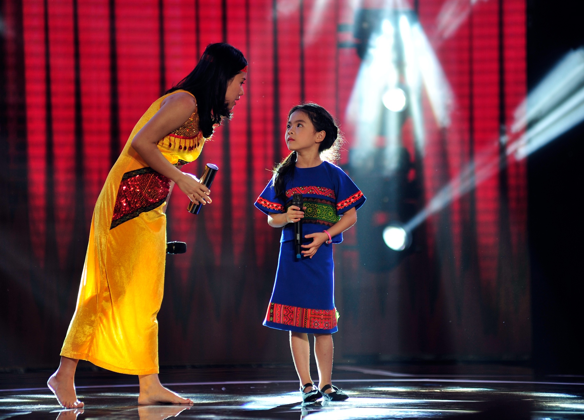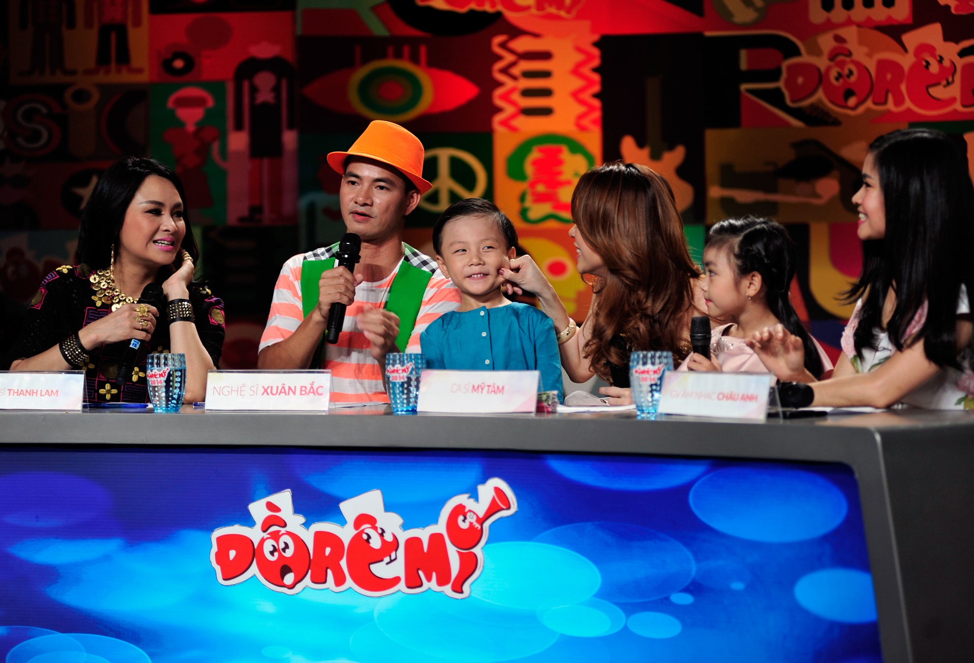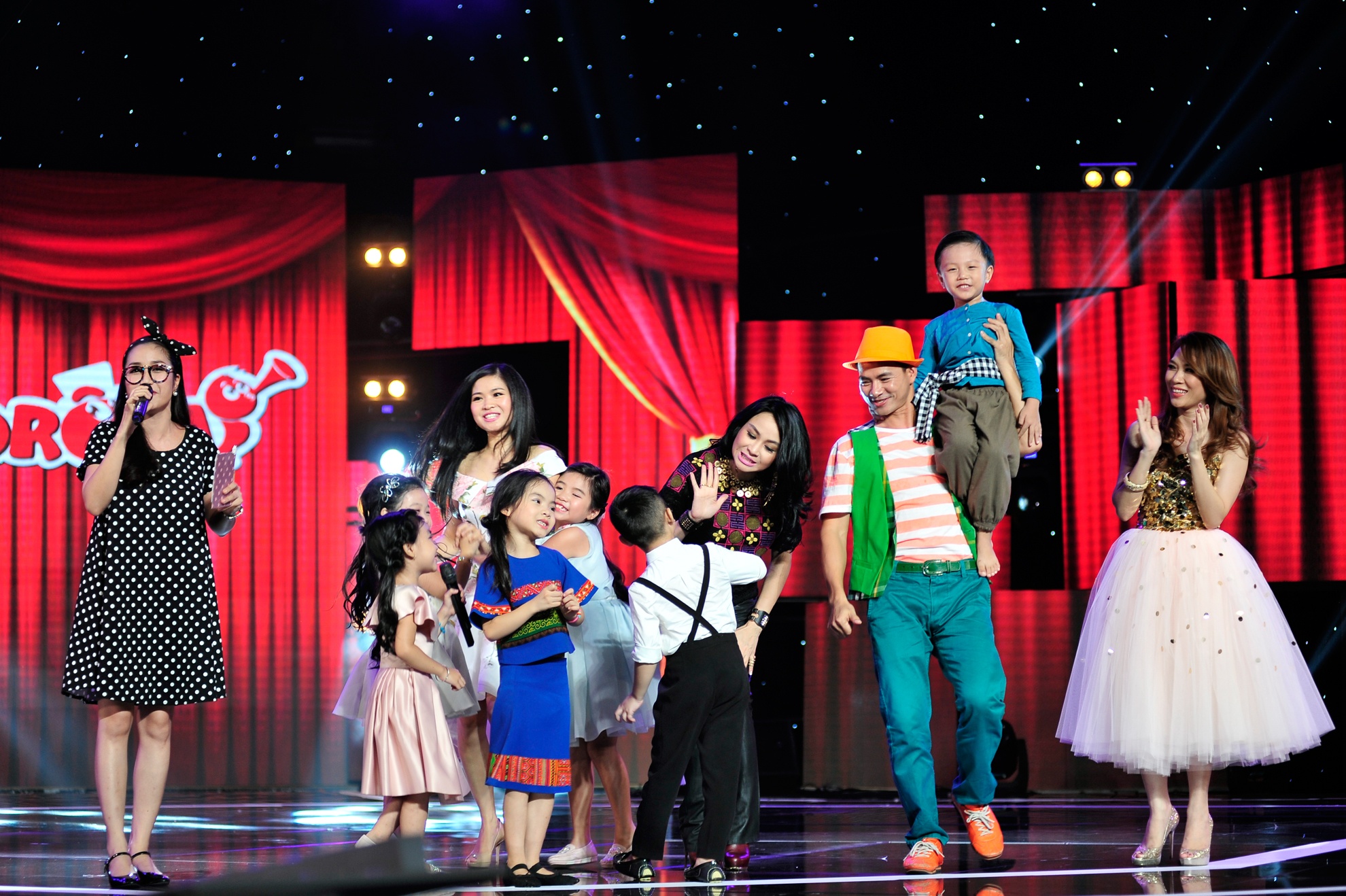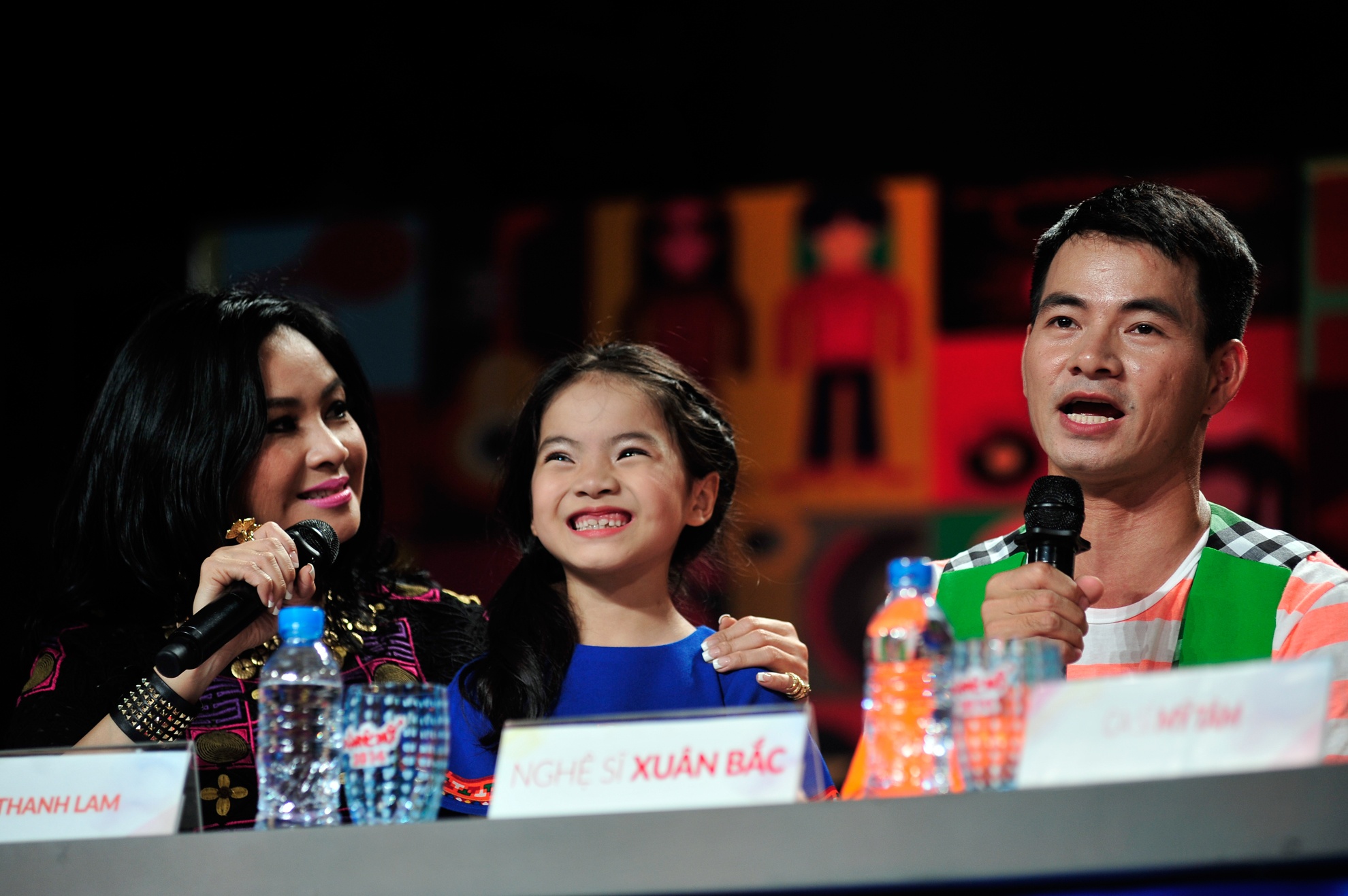 | Bốn vị giám khảo chúc mừng 6 thí sinh nhí đã hoàn thành xuất sắc phần thi trong đêm liveshow đầu tiên được truyền hình trực tiếp. Giám khảo Xuân Bắc bế "anh Ba Khía" trên vai trong khi diva Thanh Lam "đập tay" ăn mừng với Tuấn Ngọc. |