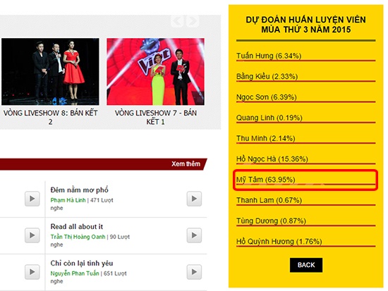 Trên trang web chính thức của Giọng hát Việt, Mỹ Tâm cũng có trong bảng đề cử và nhận được gần 65% tổng số phiếu bầu dự đoán cô sẽ là một trong các huấn luyện viên của Giọng hát Việt mùa thứ 3. Điều này càng làm các fan của cô tin rằng Mỹ Tâm đã nằm trong tầm ngắm của đơn vị sản xuất từ trước.