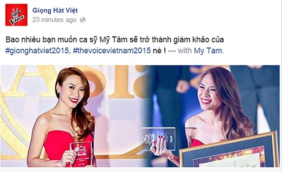 Không lâu sau những đồn đoán của fan, trang facebook chính thức của chương trình Giọng hát Việt đã đăng một bức ảnh của Mỹ Tâm với nội dung thăm dò những ý kiến đồng tình với việc Mỹ Tâm sẽ trở thành giám khảo của chương trình: “Bao nhiêu bạn muốn ca sĩ Mỹ Tâm sẽ trở thành giám khảo của Giọng hát Việt 2015?”.
