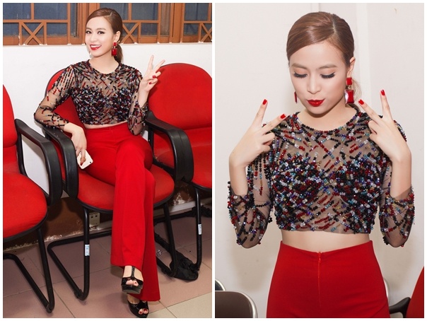 Hoàng Thùy Linh nổi bật trên sân khấu The Voice tối 6/9 với bộ cánh hiện đại, cá tính. Áo voan mỏng đính kết sáng tạo phối ăn ý cùng quần ống loe. Tông trang điểm đậm và tóc ôm sát đầu quyến rũ. Ảnh: Tiên Nguyễn
