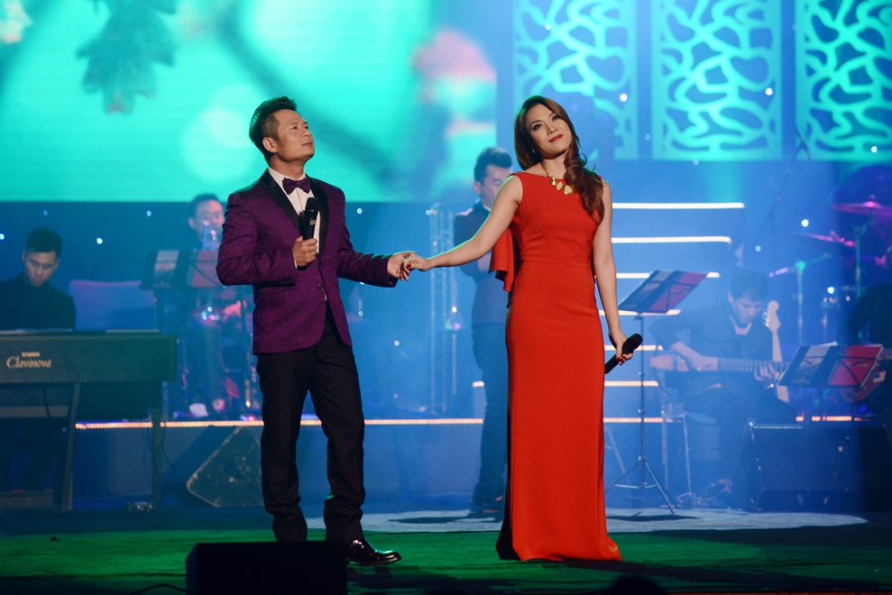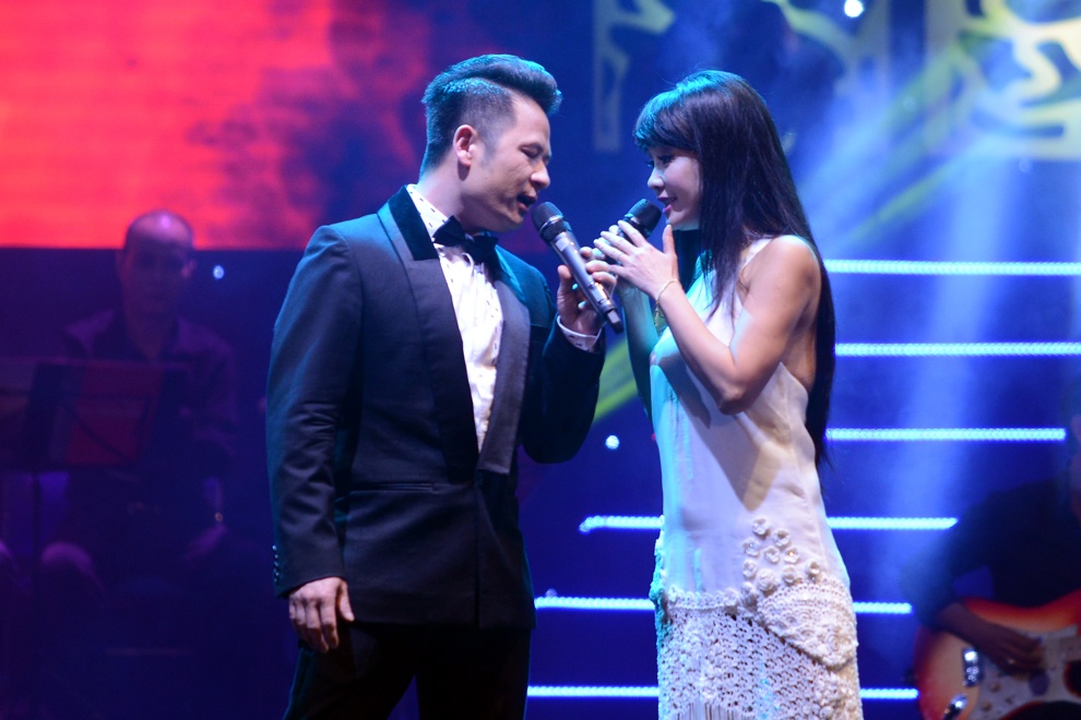 | Bằng Kiều tình tứ bên Mỹ Tâm khi trình diễn Hãy nói với em. |