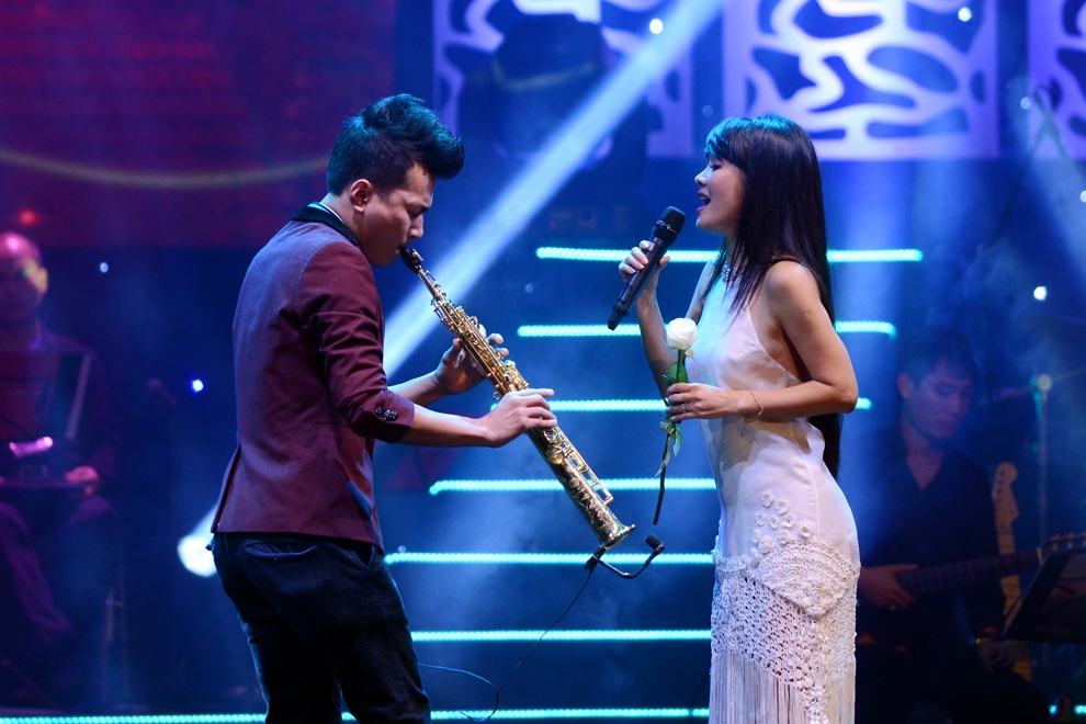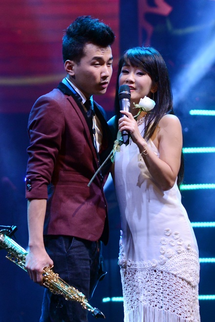 | Khoảnh khắc tình tứ của cô Bống và nghệ sĩ saxophone trẻ trong ban nhạc Background của nhạc sĩ Dương Cầm khiến nhiều khán giả thích thú. |