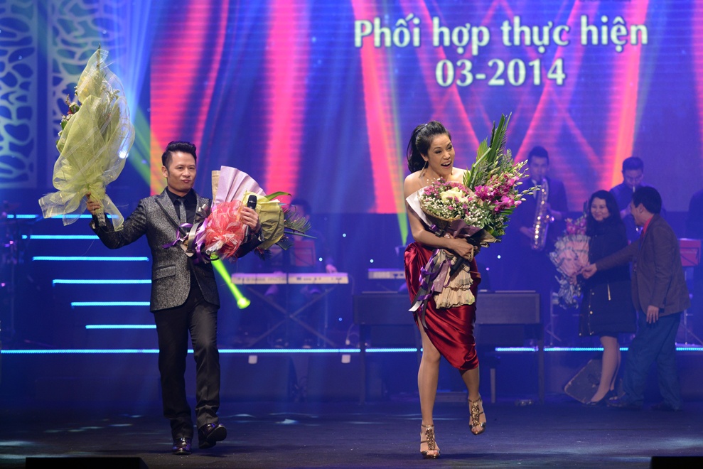| Bằng Kiều và Thu Phương hạnh phúc ôm bó hoa khán giả tặng mình. |