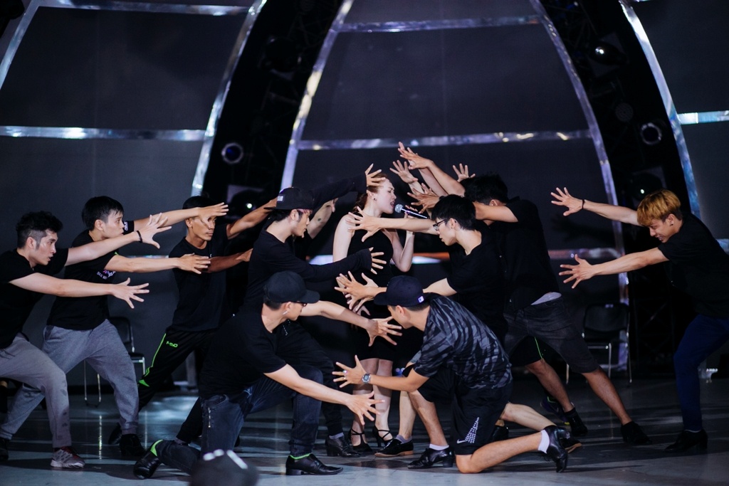 Phần trình diễn của "họa mi tóc nâu" được đầu tư công phu với sự trợ giúp của 2 vũ đoàn MTE, UDG. |