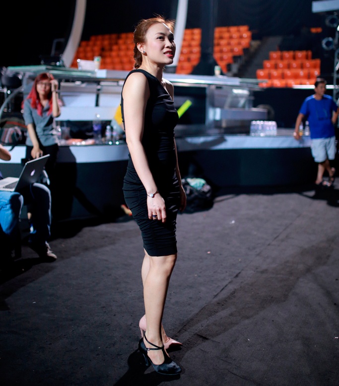 Giọng ca gốc Đà Nẵng mặc đầm lệch vai, tóc thắt bím và trang điểm nhẹ nhàng. Cô còn cẩn thận chọn giày phù hợp để tập nhảy cùng vũ đoàn. |