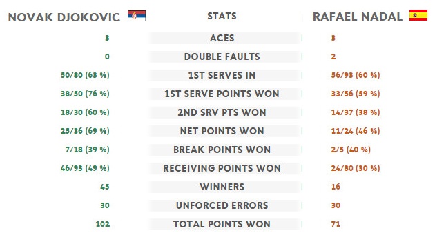 | Thống kê trận đấu cho thấy sự vượt trội của Djokovic. |