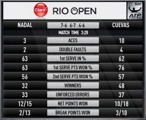 Chuỗi ngày miệt mài tìm kiếm danh hiệu ATP của Rafael Nadal vẫn chưa mang lại kết quả tích cực. Lọt vào bán kết Rio Open, Rafa tưởng chừng sẽ dễ dàng giành vé đi tiếp khi chỉ phải đối mặt với Pablo Cuevas, tay vợt không được xếp hạng hạt giống.