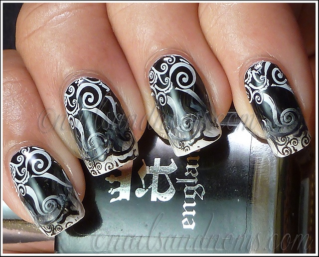 | Sự kết hợp của màu đen - trắng và những hoạ tiết cầu kỳ tạo nên bộ móng tay ấn tượng và ma quái. |