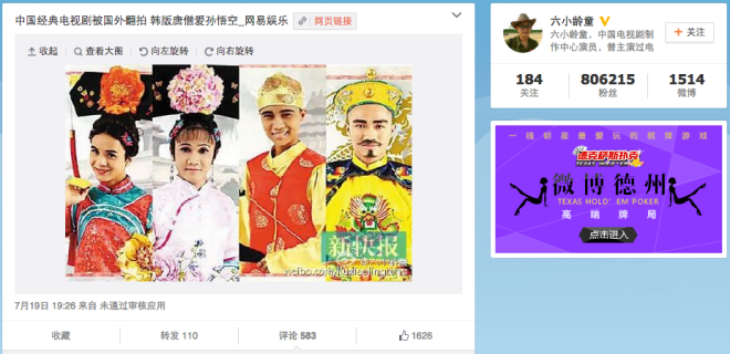 Sau khi tìm hiểu, thực tế, nam diễn viên Tây du ký đang trích dẫn một bài báo tổng hợp các phiên bản làm lại của phim truyền hình kinh điển Trung Quốc ở nước ngoài.
