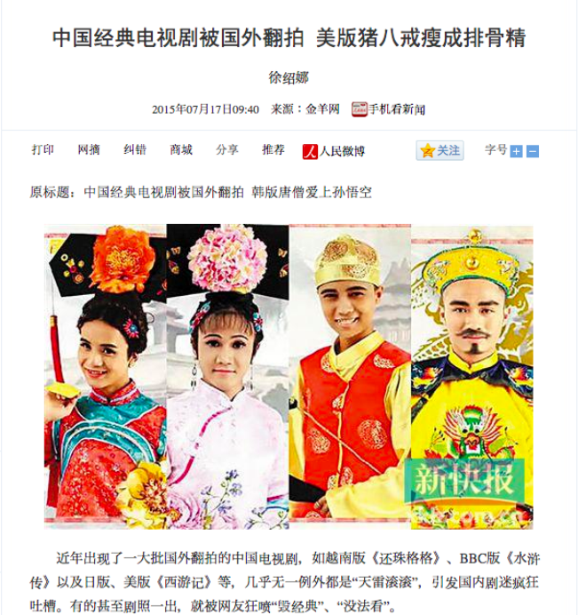 | Bài báo tổng hợp các phiên bản làm lại theo phim truyền hình kinh điển Trung Quốc ở nước ngoài. Trong đó, clip Chầu hoan cua chống cũng được nhắc đến. |