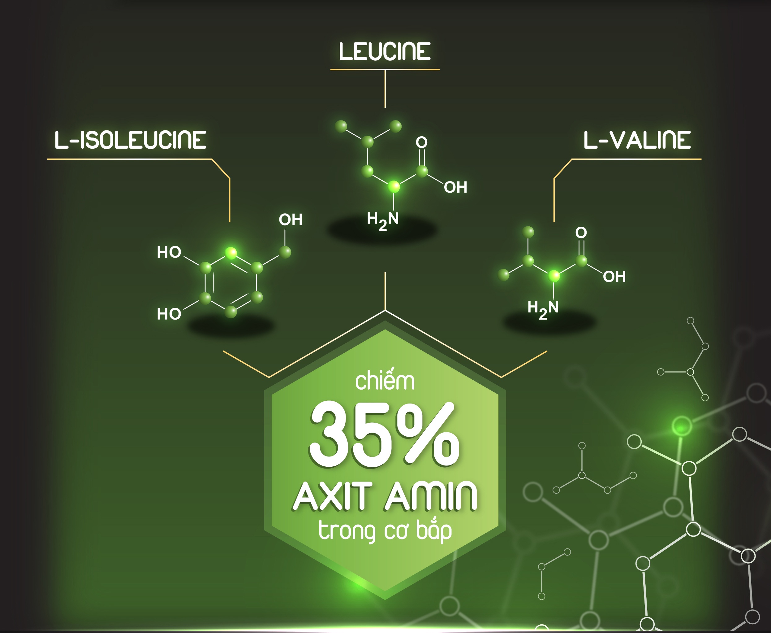 Axit amin leucine đóng vai trò chủ đạo trong việc dẫn valine và isoleucine kích hoạt quá trình tổng hợp protein cho cơ bắp, giúp xây dựng cơ bắp cho cơ thể. Bằng cách bổ sung leucine, đặc biệt là trong trạng thái cơ phải làm việc căng thẳng, việc sản xuất protein và phát triển cơ bắp sẽ diễn ra liên tục.