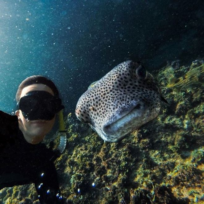 | Với mong ước trở thành nhiếp ảnh gia thám hiểm, cậu một chiếc GoPro (Camera hành trình) nhỏ, quay và chụp lại những chuyến lặn biển, nhảy dù, lái mô tô địa hình xuyên sa mạc,... Đây là một bức ảnh selfie của cậu với cá nóc.  |