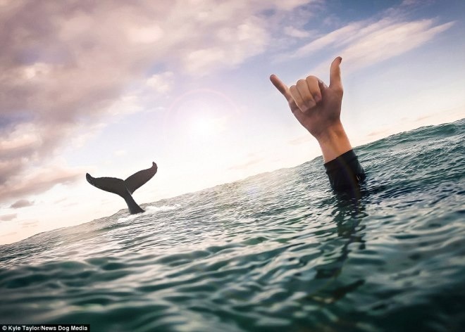 | Kyle tạo biểu tượng "shaka" cùng người bạn cá heo. |