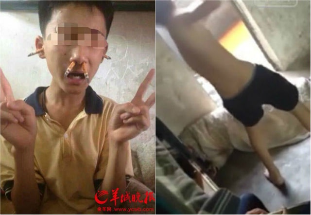 | Xiaoliang bị nhét thuốc lá vào mũi, tai. Cậu bị đánh đập bởi chính bạn cùng lớp. |