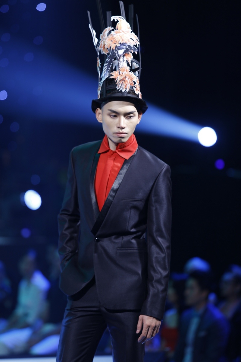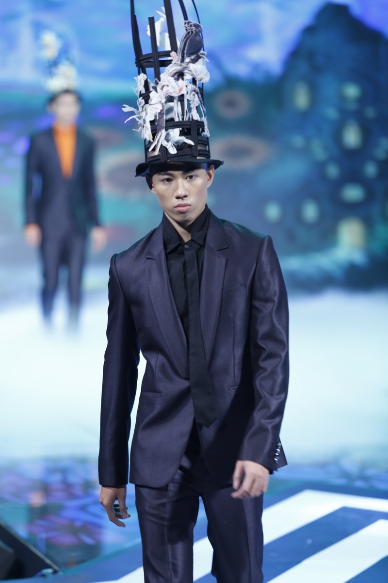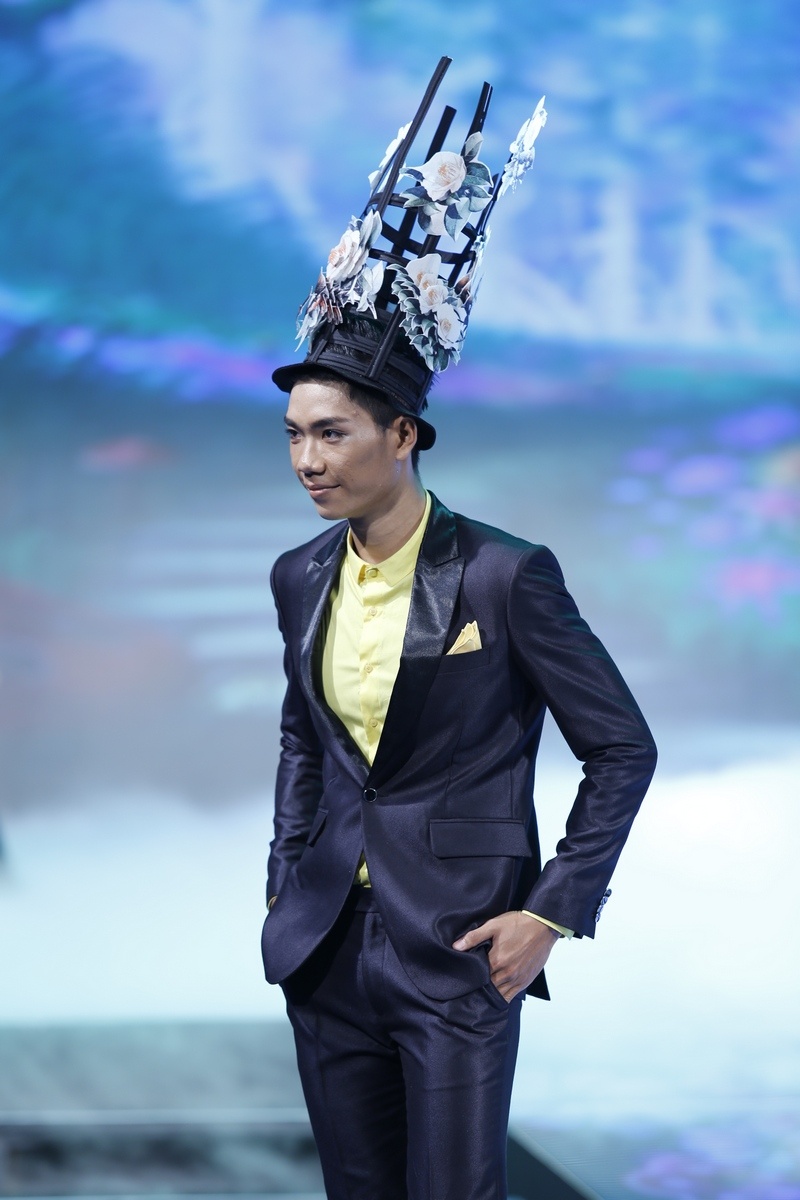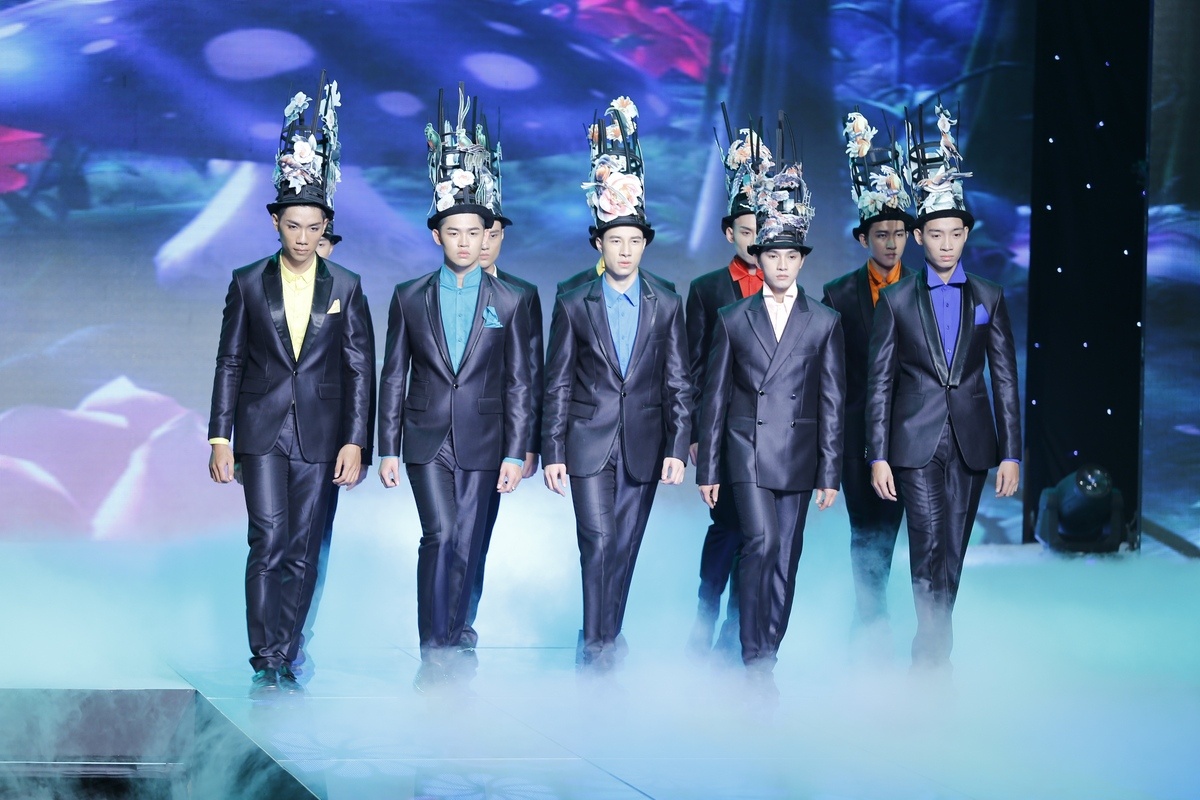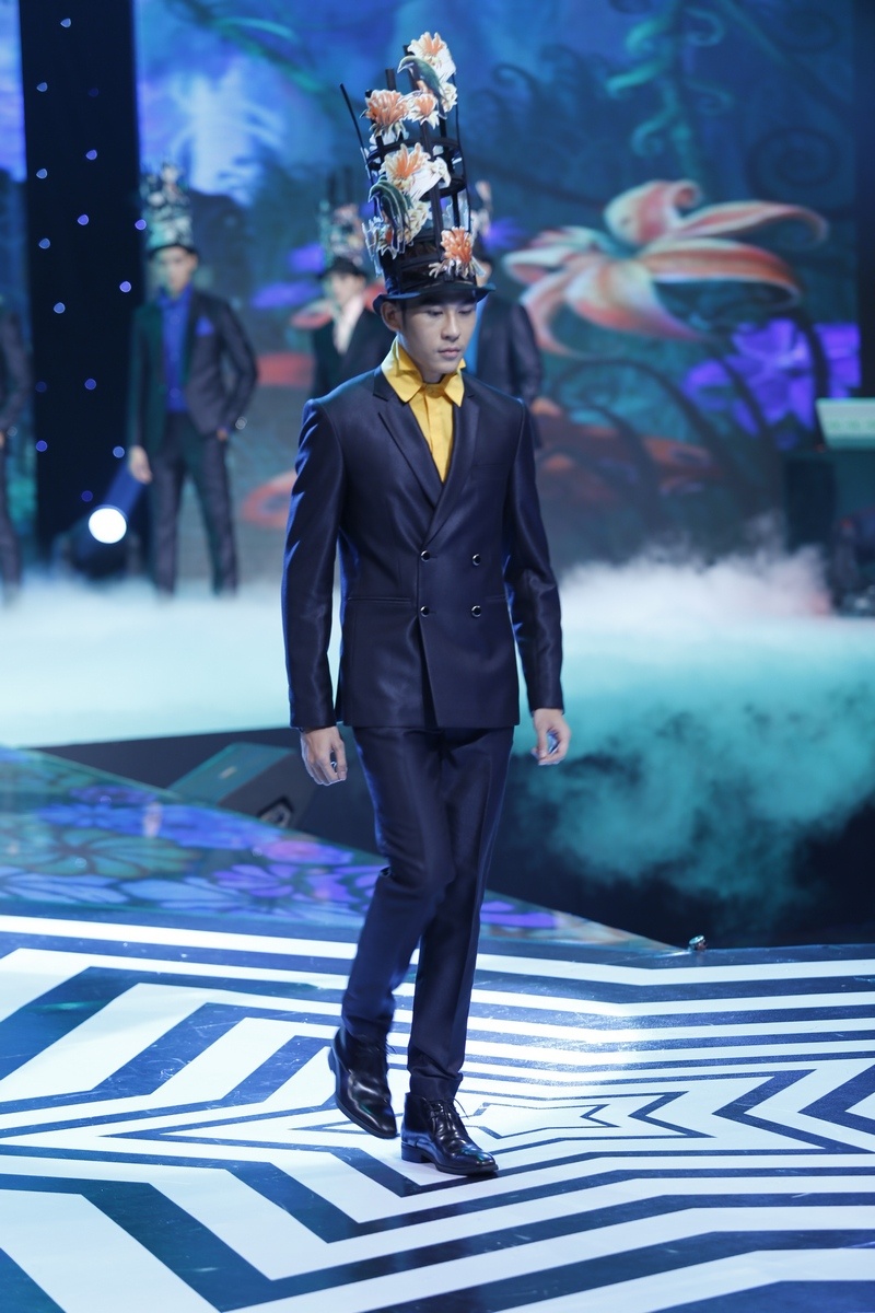 | Dàn thí sinh nam siêu mẫu gồm 11 người thể hiện BST thời trang của Công Trí. Các thiết kế bao gồm vest kết hợp cùng sơ mi và nón hoa lạ mắt. |