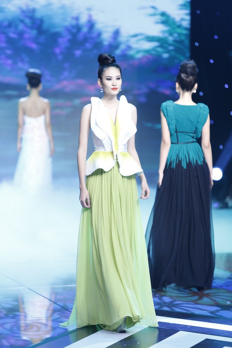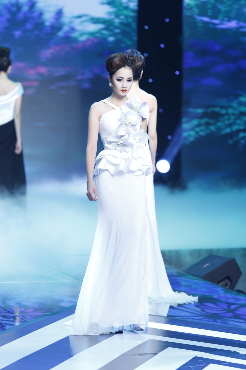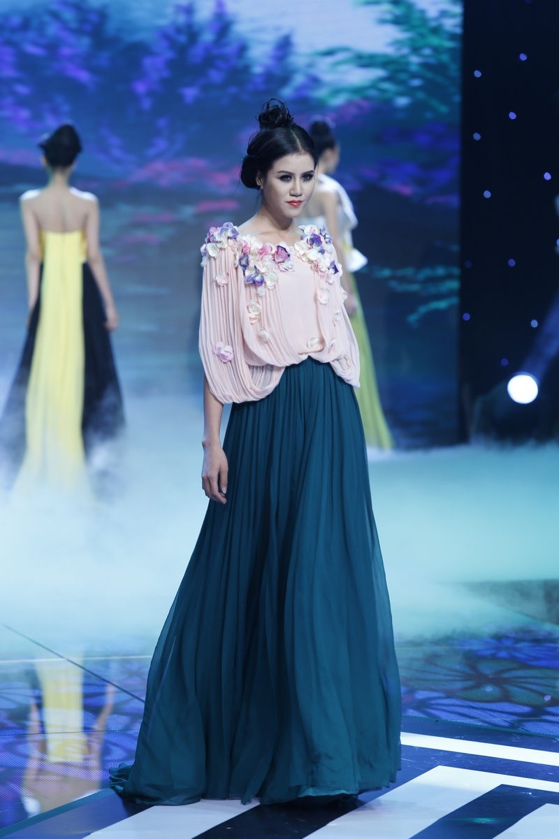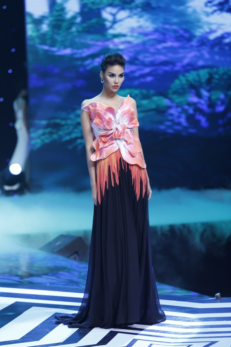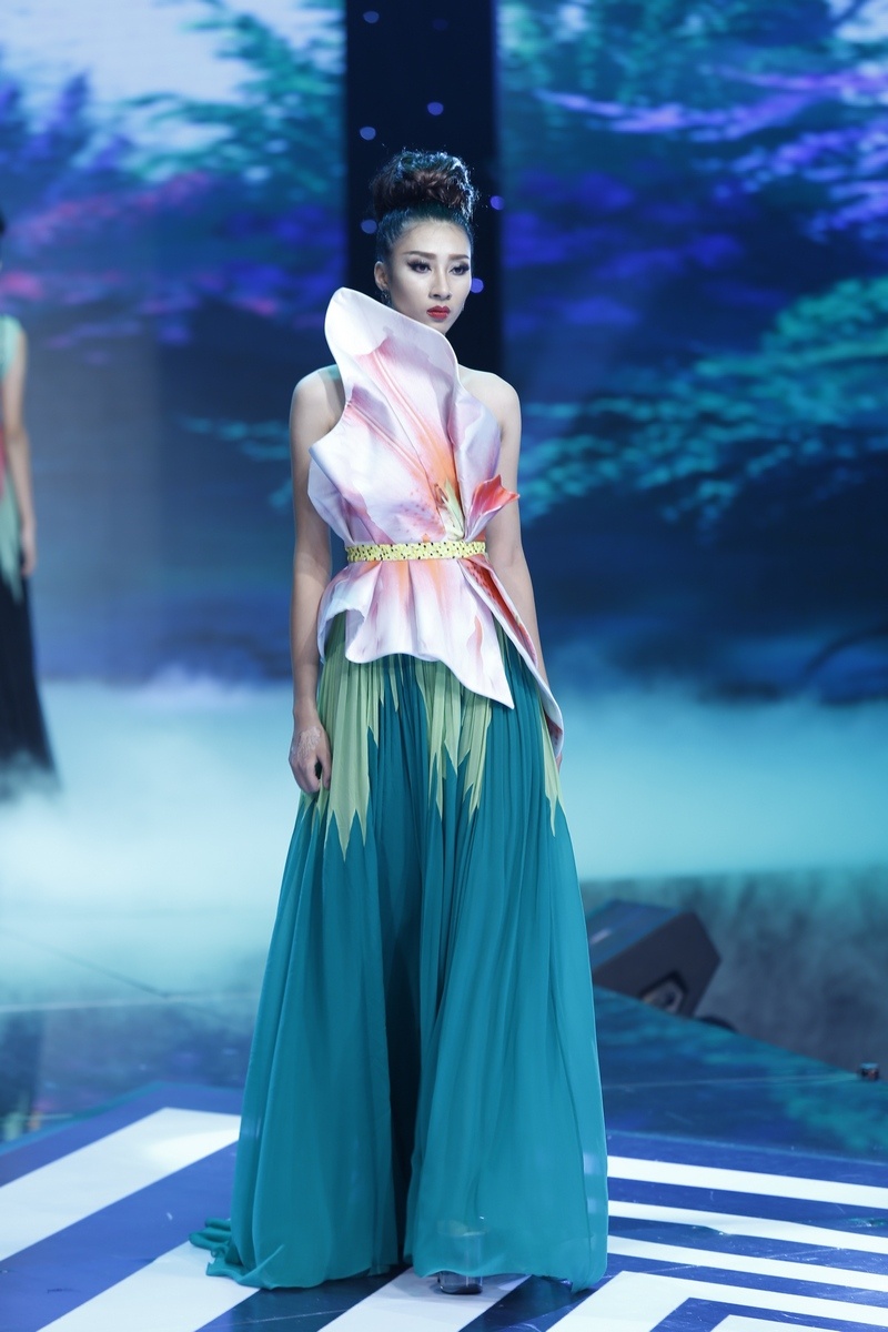 | Sau màn diễn ấn tượng của thí sinh nam là lượt diễn của 15 cô gái. Minh Tú mở màn diễn với trang phục dạ hội lấy cảm hứng từ những cánh hoa mềm mại. |