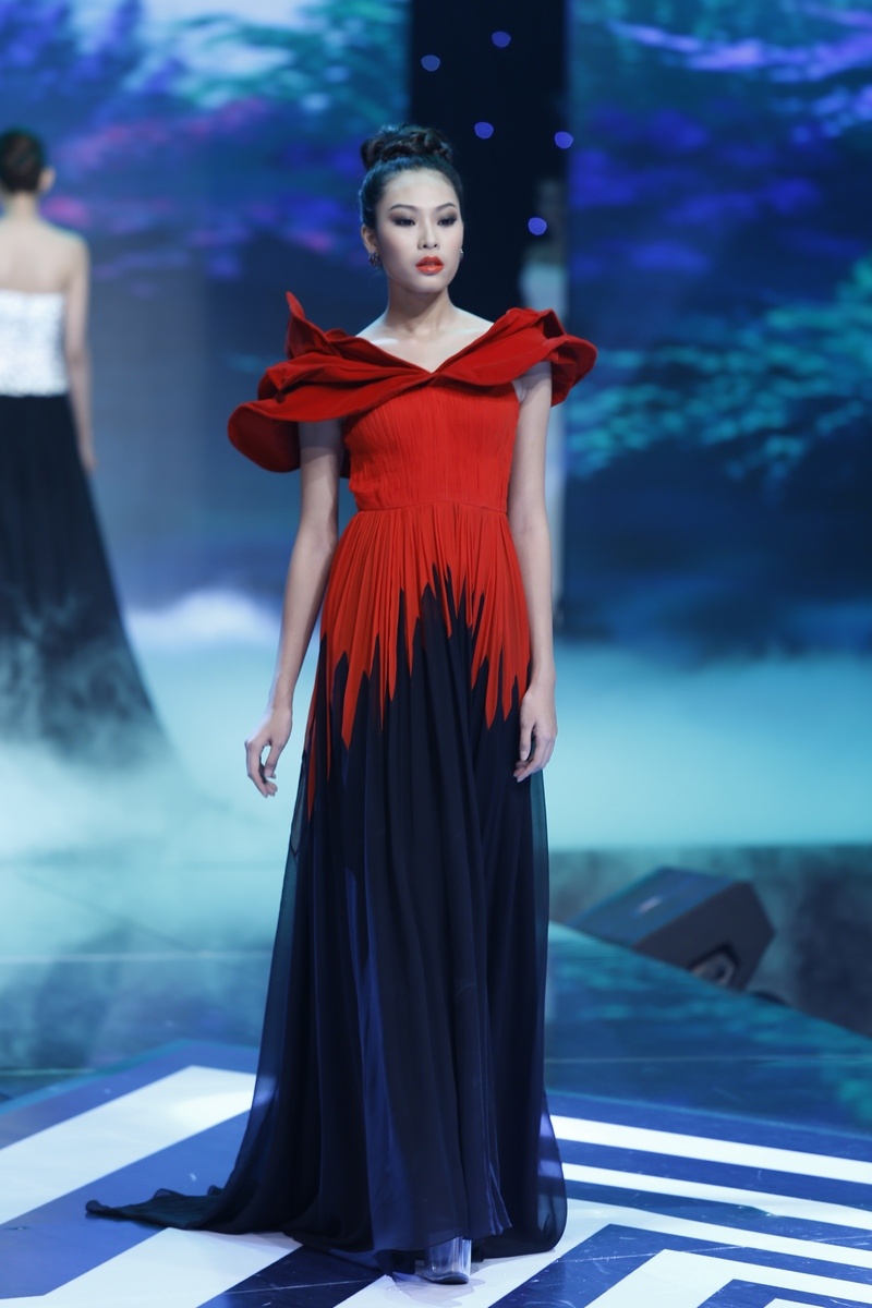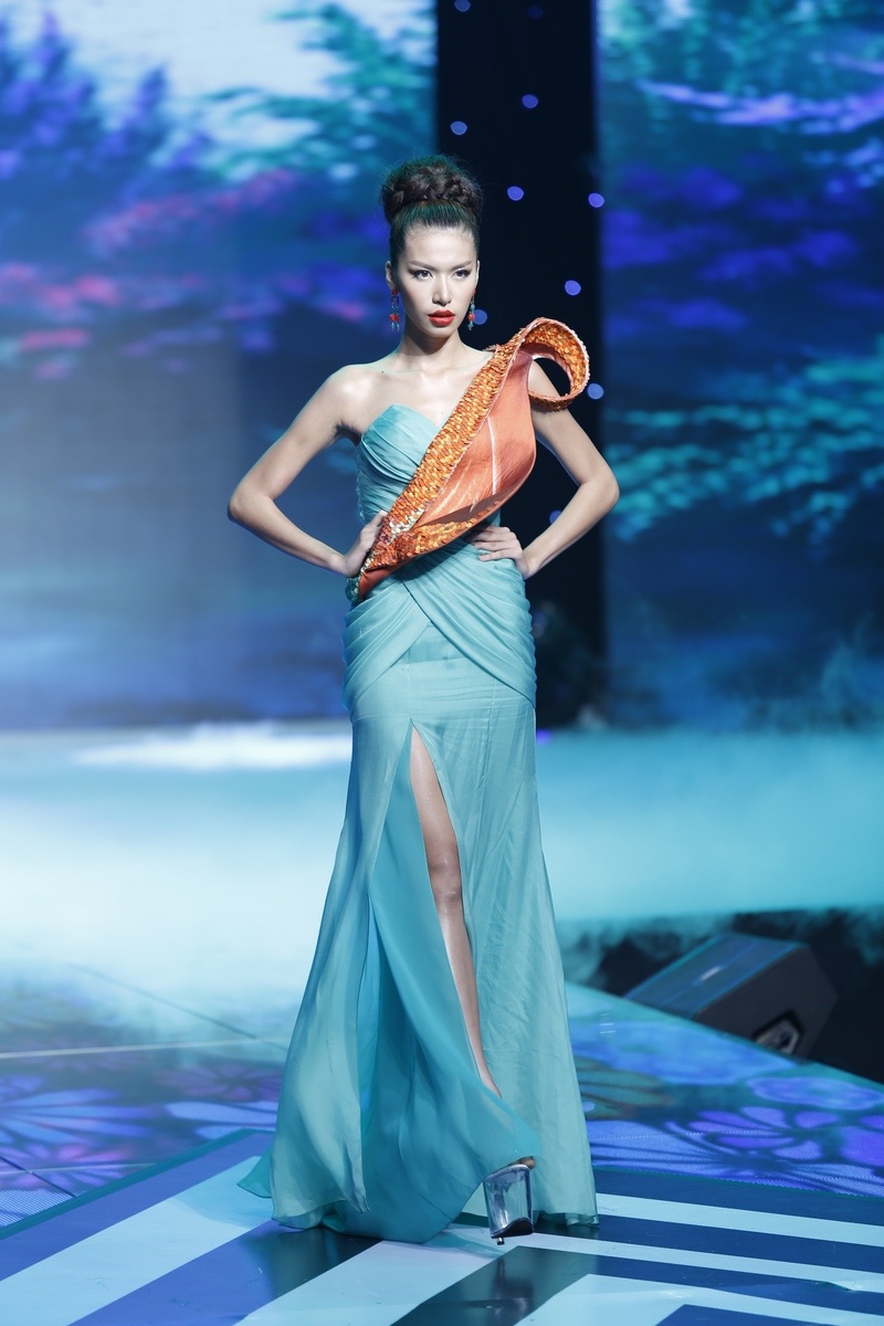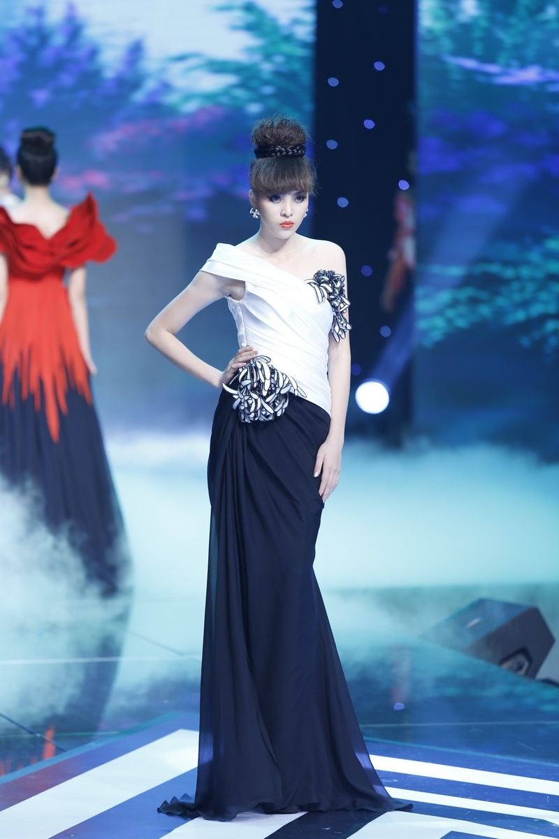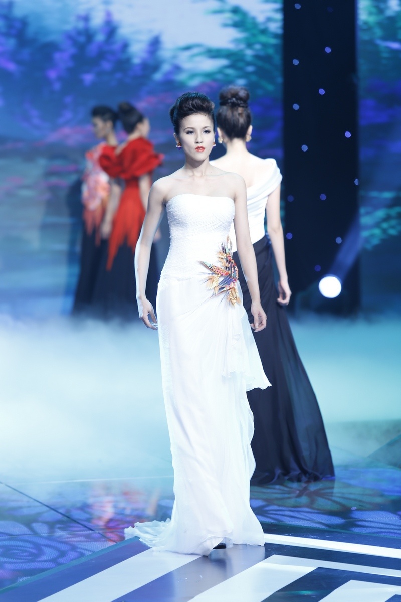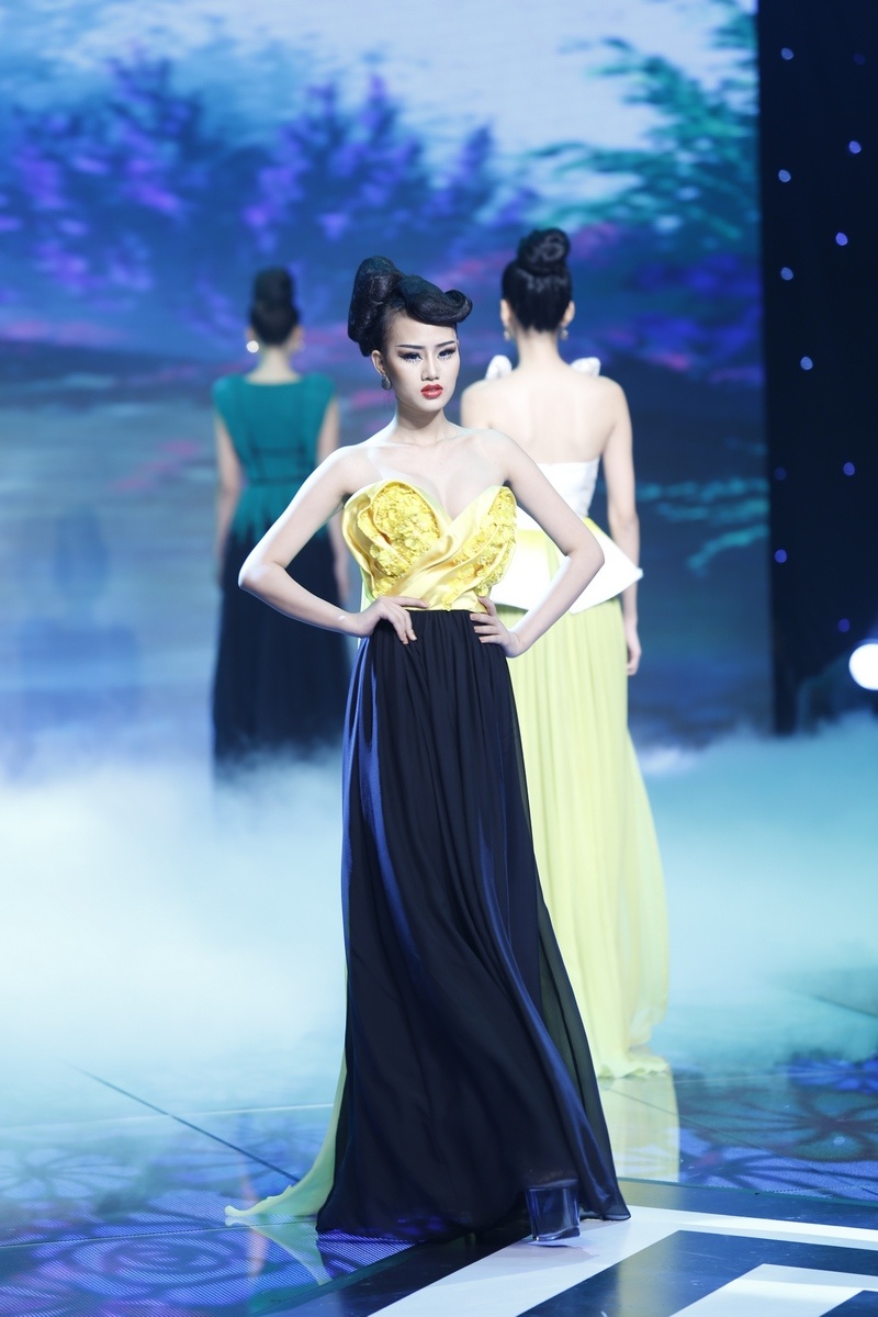 | Sau màn diễn ấn tượng của thí sinh nam là lượt diễn của 15 cô gái. Minh Tú mở màn diễn với trang phục dạ hội lấy cảm hứng từ những cánh hoa mềm mại. |