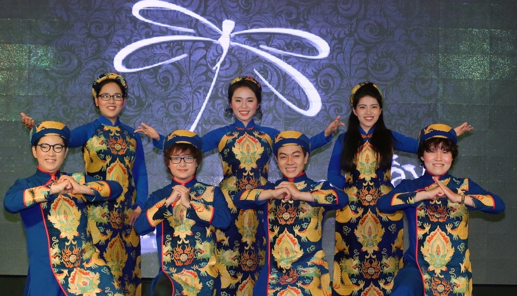 Á quân chương trình Cười xuyên Việt phiên bản nghệ sĩ xuất hiện nổi bật với đầm họa tiết rồng tại sự kiện ra mắt chương trình Cười xuyên Việt - Tiếu lâm hội vào trưa 8/3.