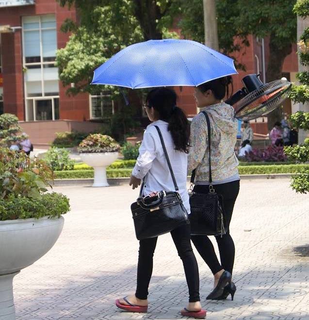 | Sinh viên Học viện Báo chí mang theo quạt khi tới trường. |