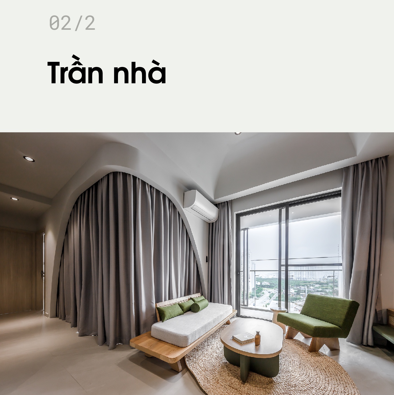 Trần nhà ban đầu mà chủ đầu tư bàn giao chưa phù hợp với không gian. Để cải thiện tình trạng này, trần nhà đã làm thành hệ vòm 4 chiều.